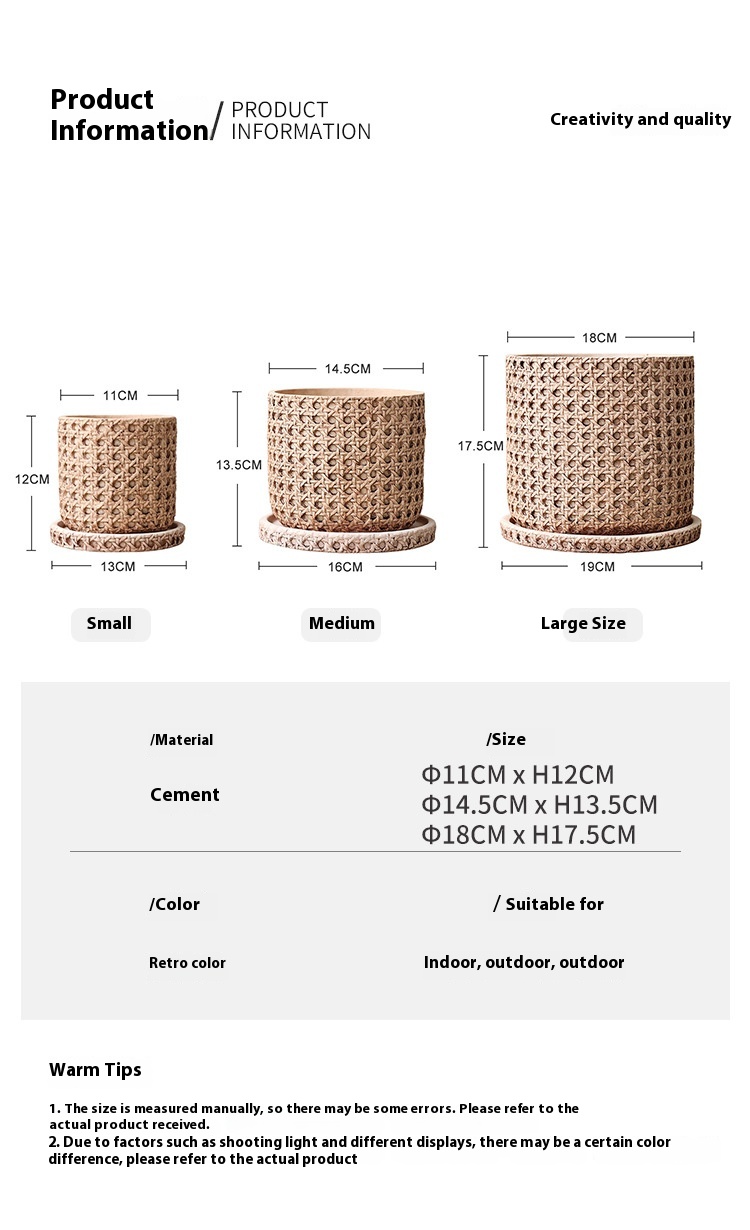 Product information: Features: breathable, not easy to deform, firm and durable Bottom diameter: 12CM Usage: Desktop Material: Cement Size: without tray, with tray Manufacturing method: Concrete Style: pastoral style Process: surface painting Packing list: Cement vase*1 +Pallet*1/Cement vase*1 Product Image: